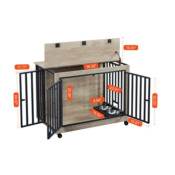 Furniture Style Dog Crate Side Table With Feeding Bowl, Wheels, Three Doors, Flip-Up Top Opening. Indoor, Rustic Brown, Grey
