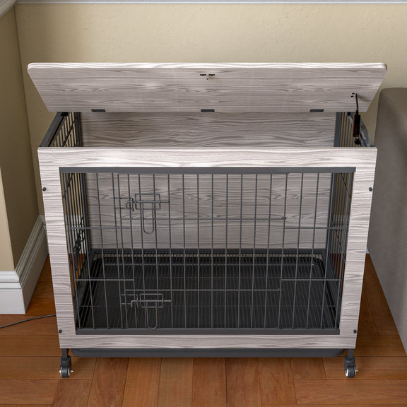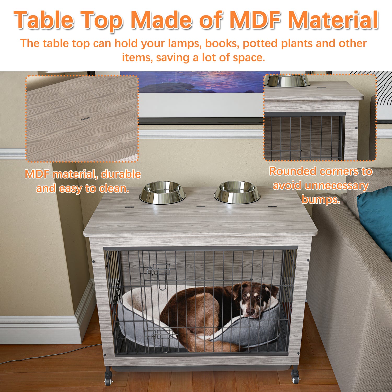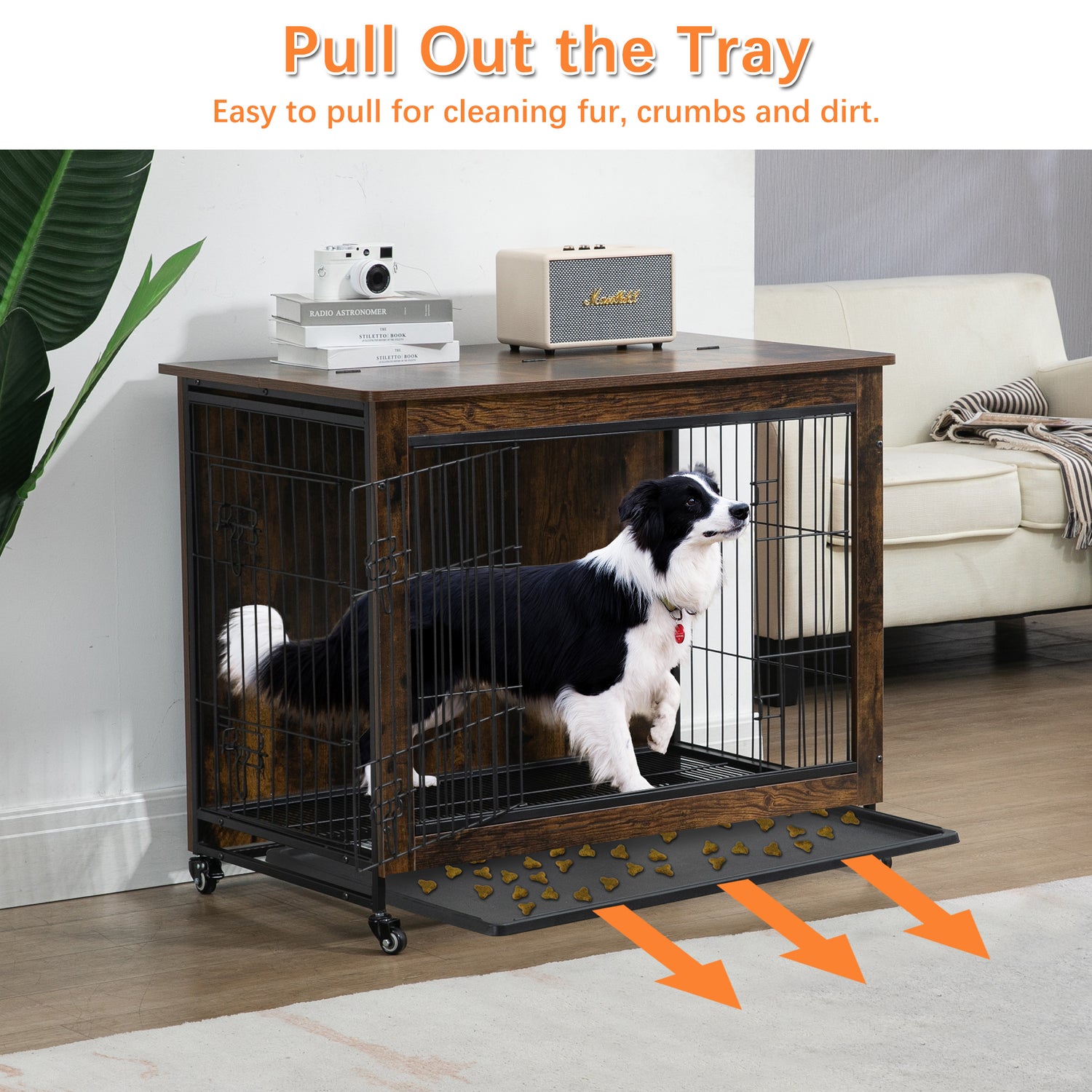 Dog Crate Furniture , Heavy Duty Wooden Dog Kennel with Double Doors & Flip-Top for Large Dogs, Furniture Style Dog Crate End Table with Wheels