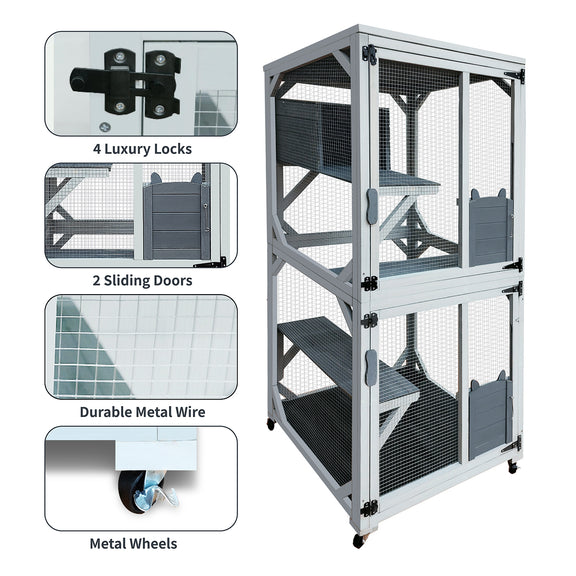 30.7" Wooden Catio Outdoor Cat Enclosure, Luxury Cat House on Wheels with Napping House, 4 Platforms & Weatherproof Asphalt Roof, Large Kitty Cat Condo Cage Shelter Playpen with Sliding Doors